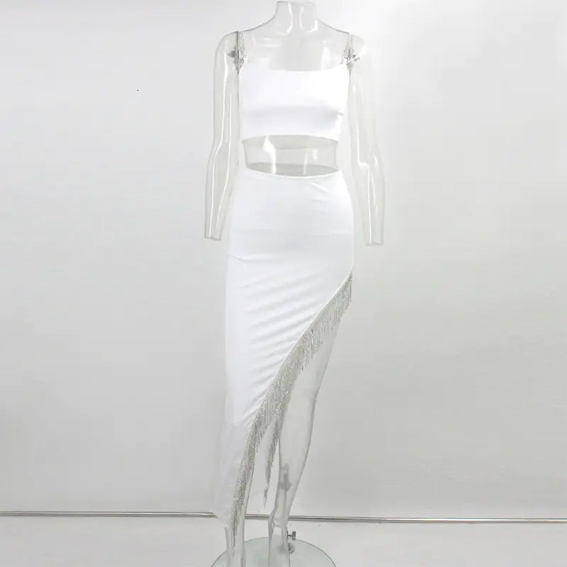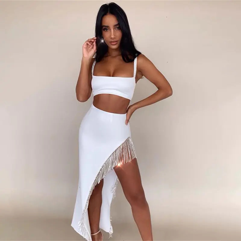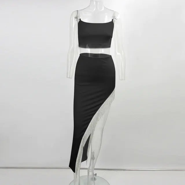 Elevate your wardrobe with our stunning two-piece set that perfectly combines elegance and comfort. This women's sling vest with tassel detailing and a chic irregular skirt is designed for the modern woman who values both style and versatility.