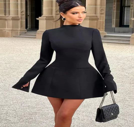 The solid color pattern exudes sophistication, while the round neck collar offers a comfortable fit. With a flattering short skirt length, this dress is tailored to enhance your silhouette and keep you looking chic.